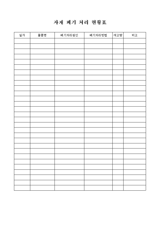 9,000원/월일자,물품명,폐기원인,폐기방법등을 기재하는 자재 폐기 처리 현황표입니다.