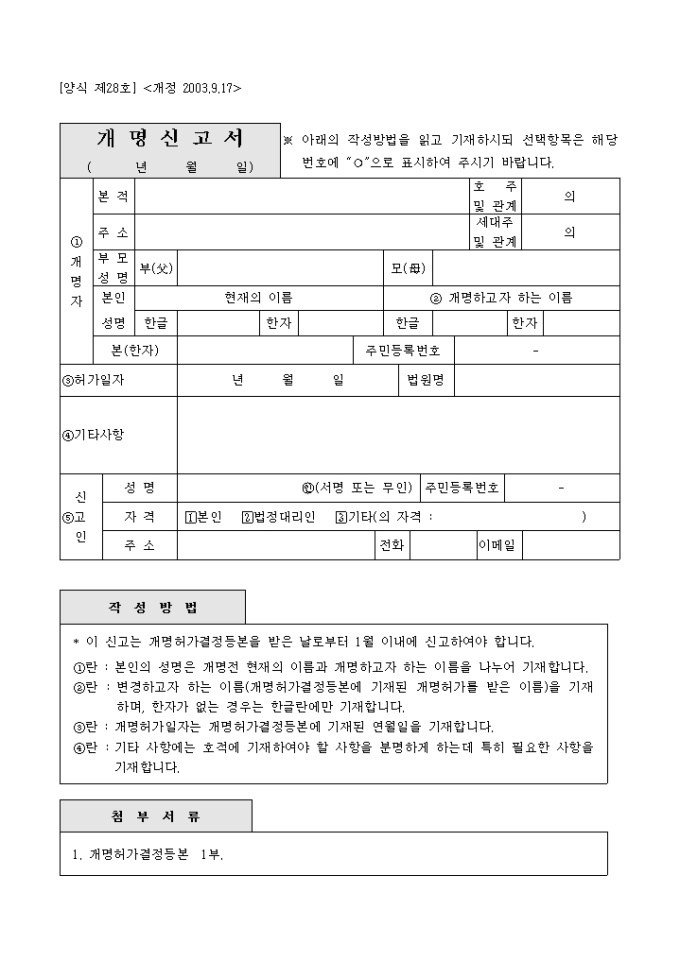 9,000원/월양식 제28호 개명신고서로 개명허가를 받고난후 신고하는 양식입니다.
