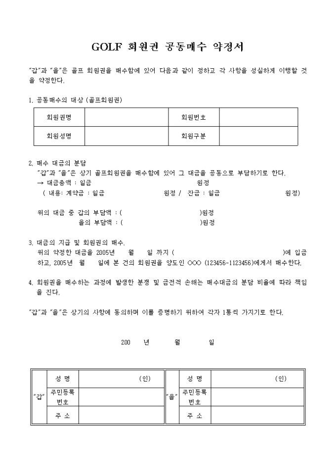 골프회원권매수약정서입니다. 갑과 을의 골프 회원권 매수함에 있어서 이를 증명하기 위한 약정서입니다.