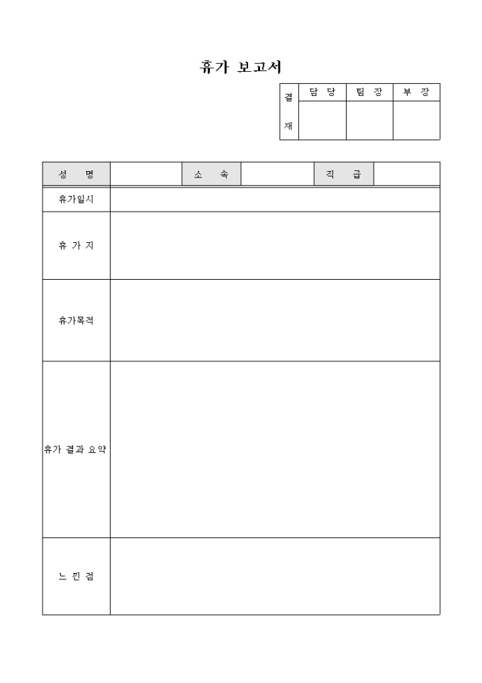 휴가철 휴가를 다녀온 후 보고를 할때 사용하는 표로 구성된 간단한 양식의 보고서 입니다.