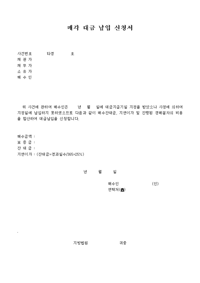 9,000원/월매각 대금 납입 신청서는 사건번호, 채권자, 채무자, 소유자, 매수인, 매수금액, 보증금, 잔대금, 지연이자 등의 항목으로 구성되어 있습니다.