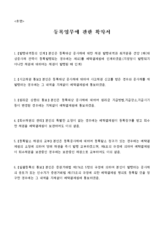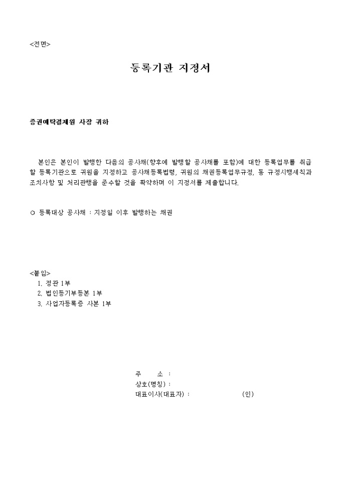 9,000원/월공사채(향후에 발행할 공사채를 포함)에 대한 등록업무를 취급할 등록기관으로 귀원을 지정하고 공사채등록법령, 귀원의 채권등록업무규정, 동 규정시행세칙과 조치사항 및 처리관행을 준수할 것을 확약하며 등록기관 지정을 요구할때 사용하는 등록기관 지정서 양식입니다.