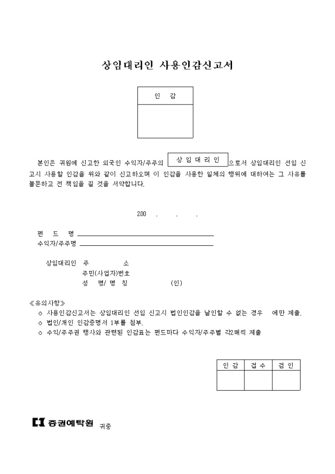 9,000원/월상임대리인 선임 신고시 사용할 인감을 신고하며 책임을 확약할 때 사용하는 상임대리인의 사용인감신고서(간접투자증권용) 입니다.
