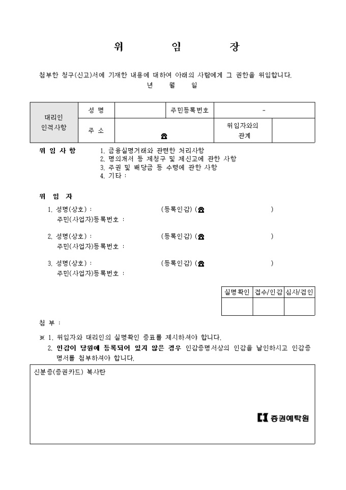 9,000원/월간접투자증권용 위임장은 금융실명거래와 관련한 처리사항, 의개서 등 제청구 및 제신고에 관한 사항, 주권 및 배당금 등 수령에 관한 사항, 기타의 위임사항이 있습니다.