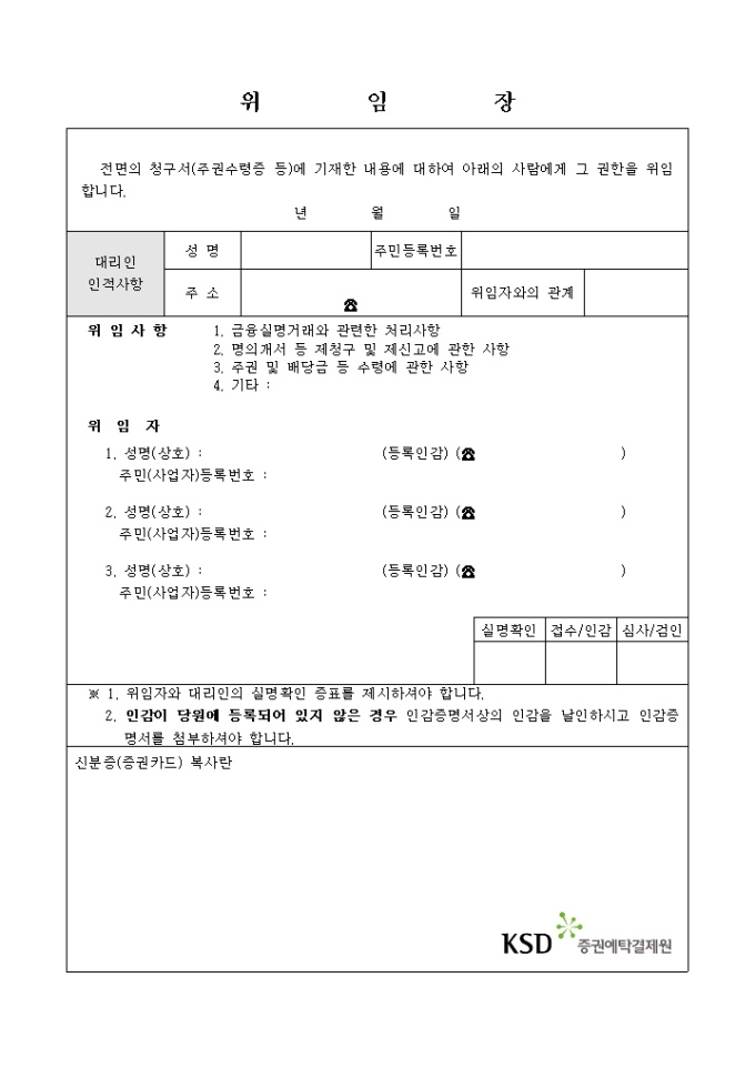 9,000원/월청구서(주권수령증 등)에 기재한 내용에 대하여 아래의 사람에게 그 권한을 위임할때 사용하는 위임장입니다.