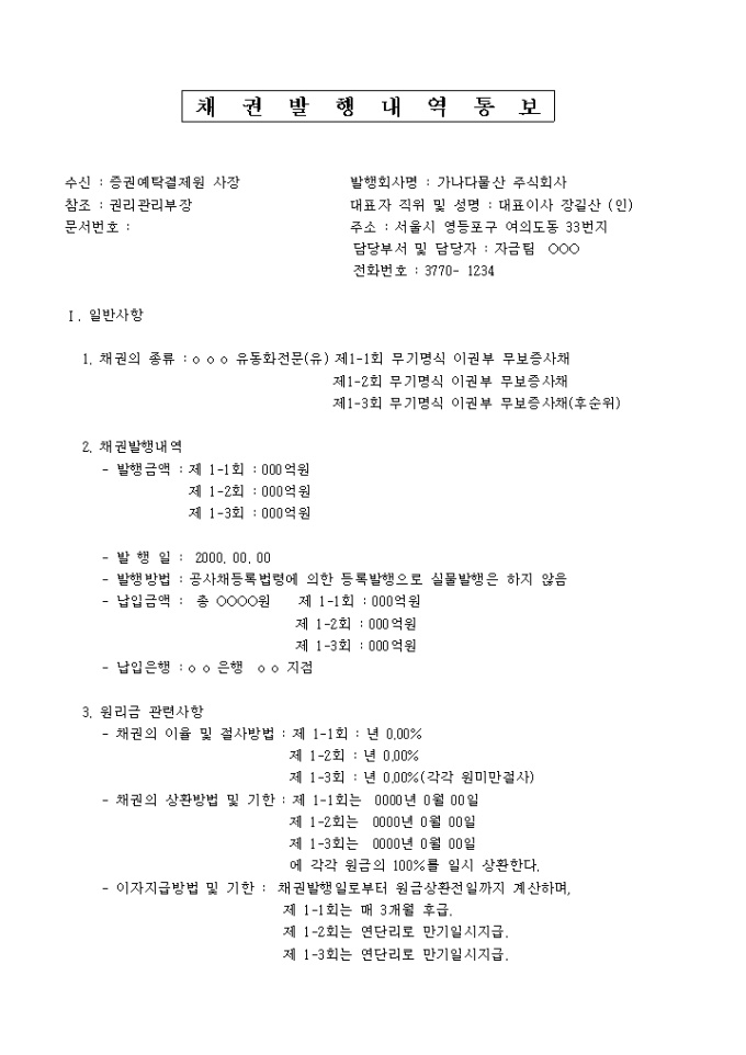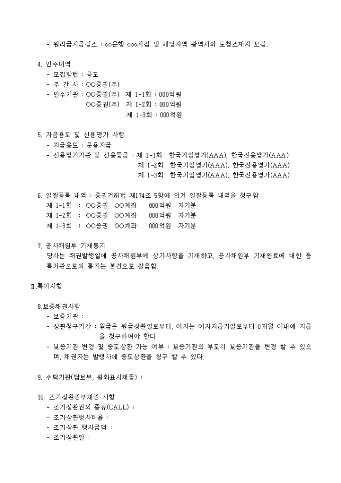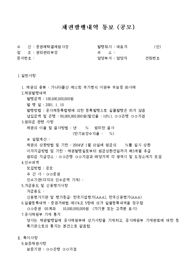9,000원/월채권발행 내역통보(공고)는 채권의 종류, 채권발행내역, 원리금 관련사항, 인수내역, 자금용도 및 신용평가사항, 일괄등록 내역, 공사채원부 기재 통지 등의 항목으로 구성되어 있는 양식입니다.