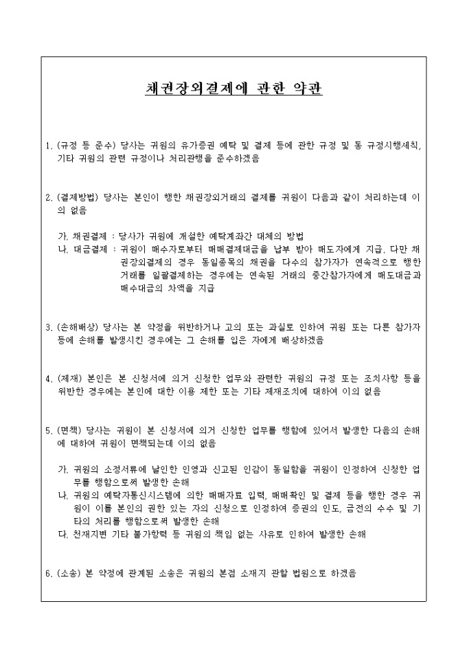 규정 등 준수, 채권과 대금에 따른 결제방법, 손해배상, 제재, 면책, 소송의 6개의 조항을 볼 수 있는 채권장외결제에 관한 약관 입니다.