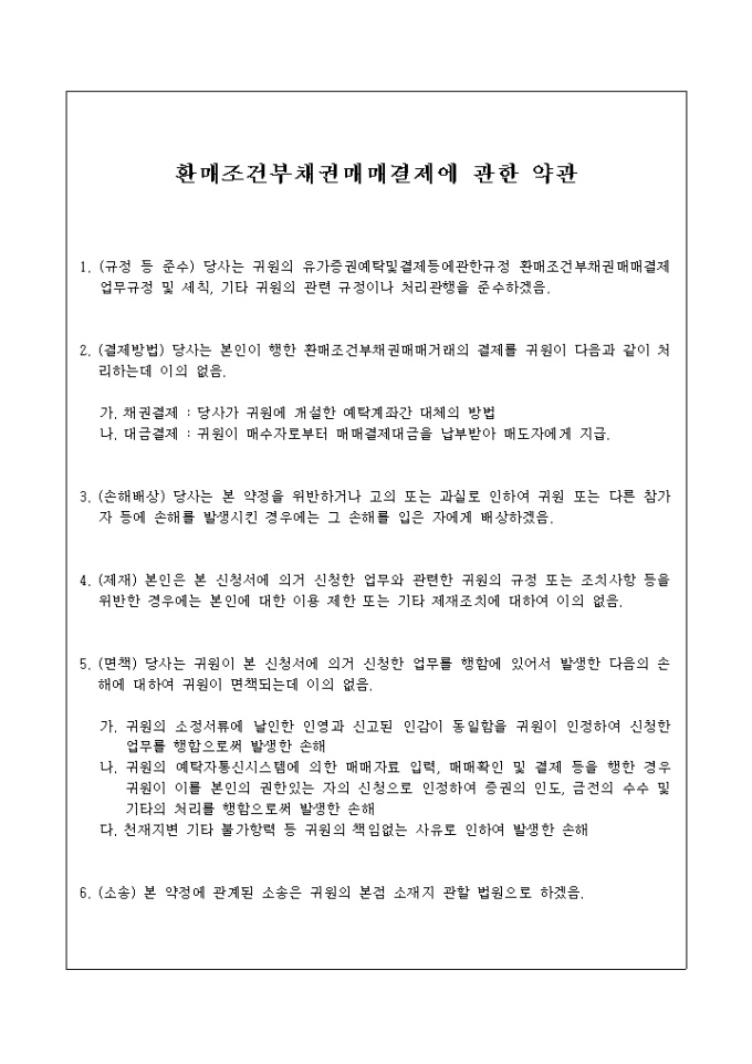 규정 등 준수, 채권과 결제에 따른 결제방법, 손해배상, 제재, 면책, 소송의 6개 조항으로 되어있는 환매조건부채권매매결제에 관한 약관 입니다.