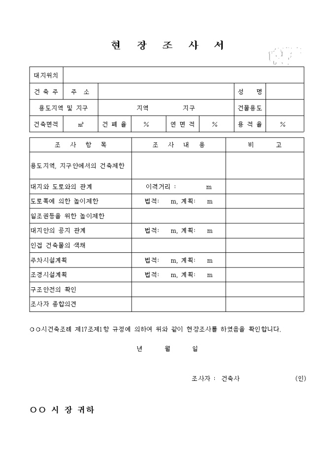 9,000원/월건축물 위치 및 대지와 도로와의 관계, 주차시설계획,조경시설,인접건축물 색채등을 조사하여 기록하는 현장조사서입니다.