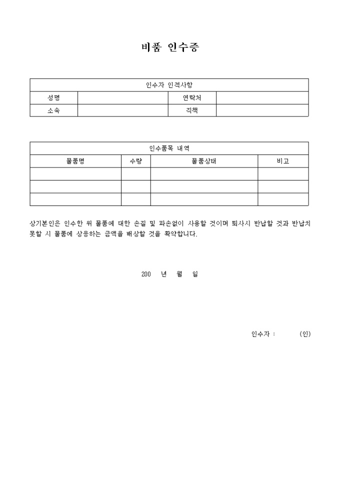 비품인수자 인적사항, 인수물품 내역, 퇴사시 반납함을 기재하는 비품인수증입니다.