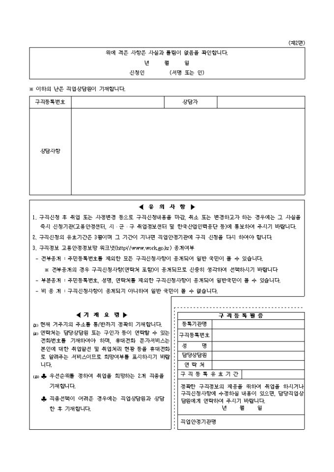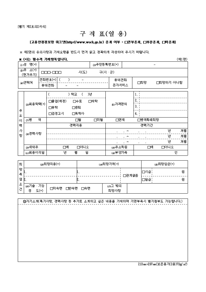 9,000원/월주요이력사항과 희망취업조건, 자기소개 등의 기재양식과 유의사항, 기재요령, 구직등록필증의 총 2장으로 된 일용직용 구직표 양식 양식 입니다.