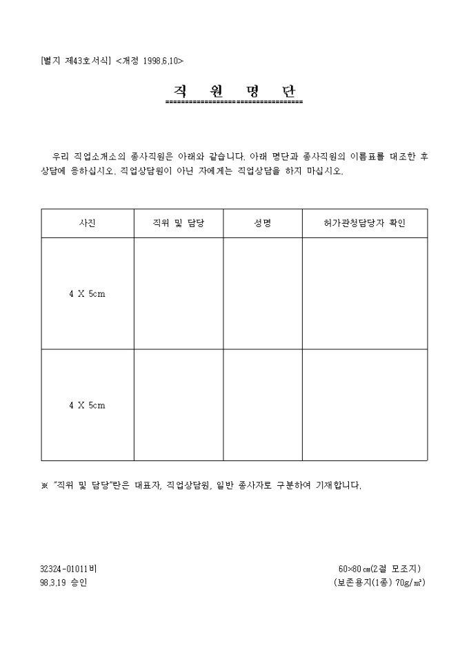 9,000원/월직업소개서 종사직원의 사진, 성명, 확인란으로 구성되어 있는 직원명단 양식 입니다.