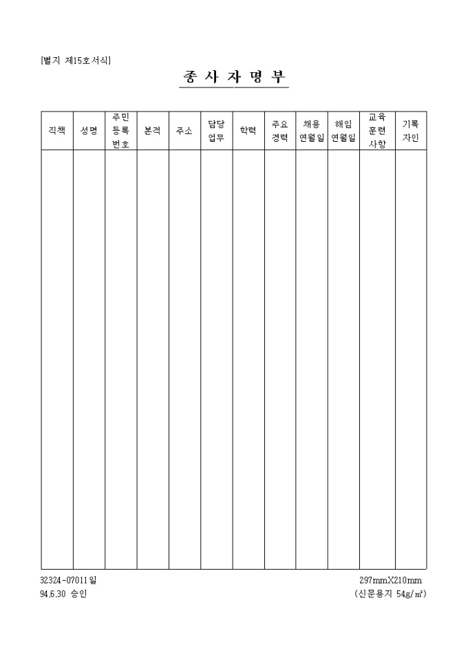 9,000원/월직책, 성명, 주민등록번호, 본적, 주소, 담당업무, 학력, 주요경력, 채용 및 해임 연월일 등의 항목으로 구성되어 있는 종사자 몇부 양식 입니다.
