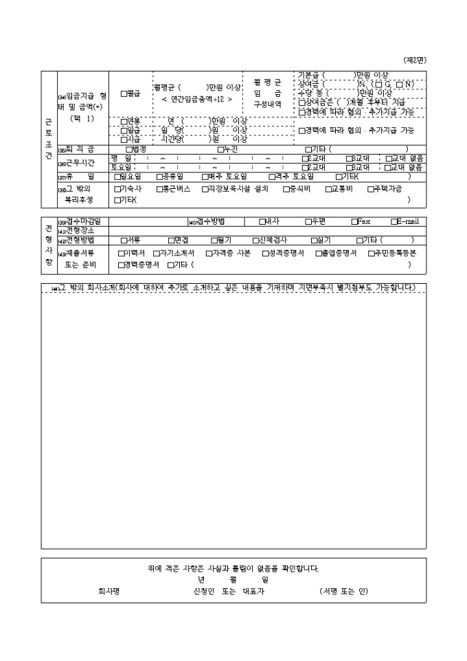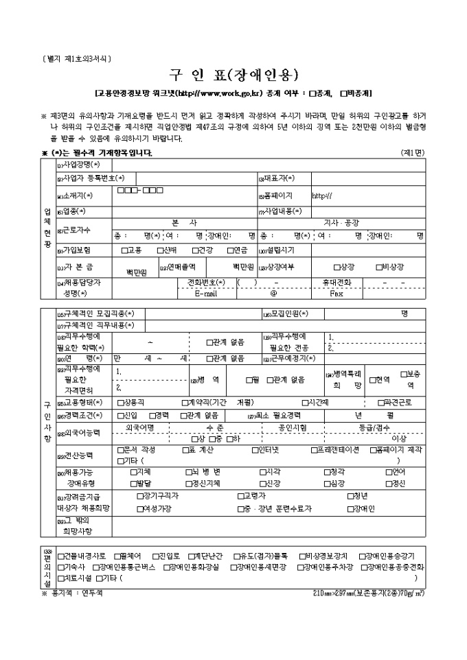 9,000원/월업체현황, 구인사항, 편의시설, 근로조건, 전형사항, 그밖의 회사소개사항 등의 기재사항과 유의사항, 기재요령의 총 3쪽 분량의 장애인용 구인표 양식 입니다.