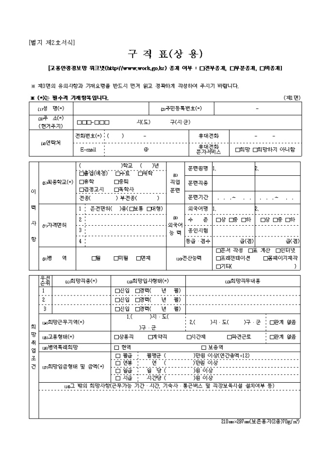 구직표(상용(별지 제2호서식)