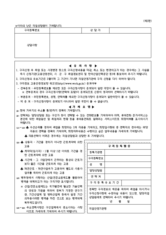 작성자의 인적사항, 이력사항, 희망취업조건, 주요경력사항 등의 기재사항과 유의사항, 기재요령, 구직등록필증의 총3쪽 분량으로 되어 있는 상용 구직표 양식 입니다.