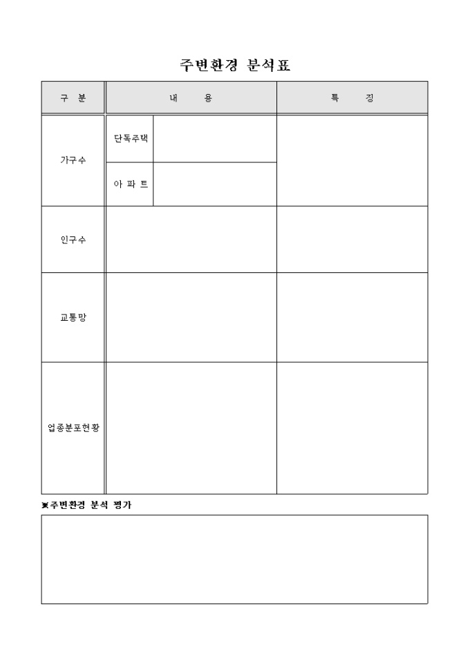 창업을 계획하고 계신분에게 필요한 서식으로 주위 상권 조사시에 사용하는 주변환경 분석표입니다.