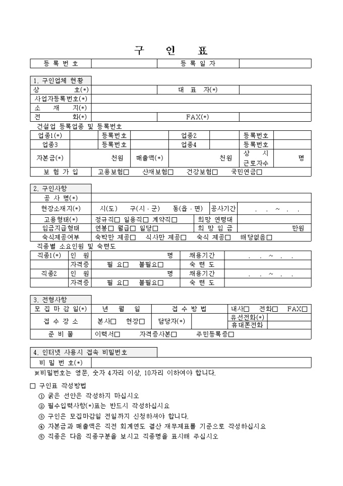 9,000원/월구인표(건설)입니다. 건설업종에 관련있는 곳에 사람을 구하는 구인표로서 구인업체의 자세한 내용, 구인사항, 전형사항 등을 작성하도록 표로서 구성되어 있습니다.