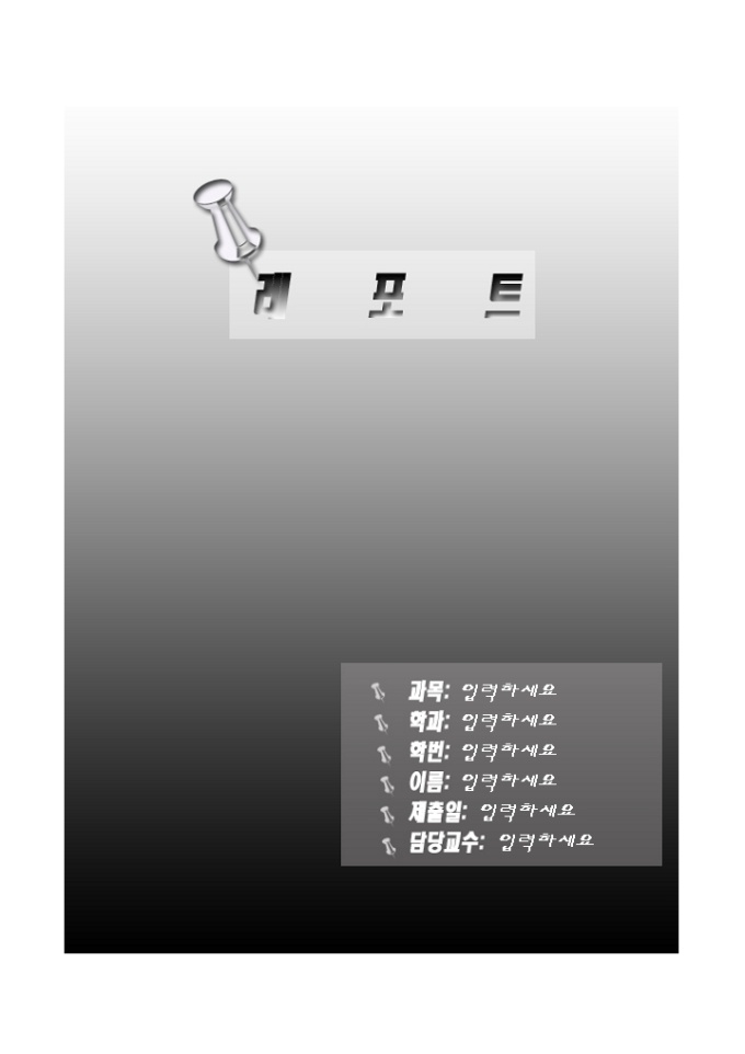 9,000원/월레포트표지(그라데이션배경압정모양)입니다. 레포트 제출시 앞의 표지로 사용하는 서식으로 그라이데이션 배경의 압정 모양으로 디자인되어 있습니다.