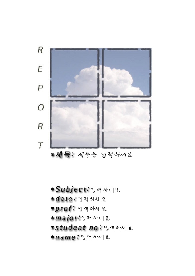 9,000원/월레포트표지(창문사이로보이는구름배경) 레포트 제출시 앞의 표지로 사용하는 서식으로 창문사이로보이는구름배경으로 디자인되어 있습니다.
