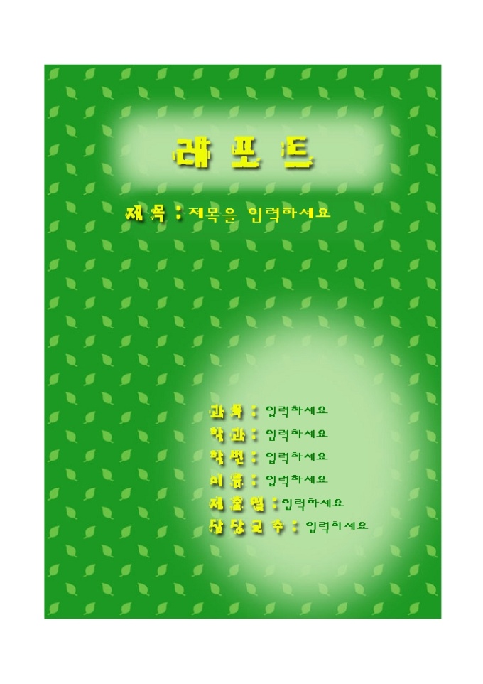 9,000원/월레포트표지(초록나뭇입배경화사한) 레포트 제출시 앞의 표지로 사용하는 서식으로 초록나뭇입배경화사한 모양으로 디자인되어 있습니다.