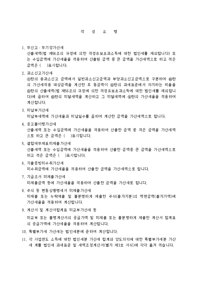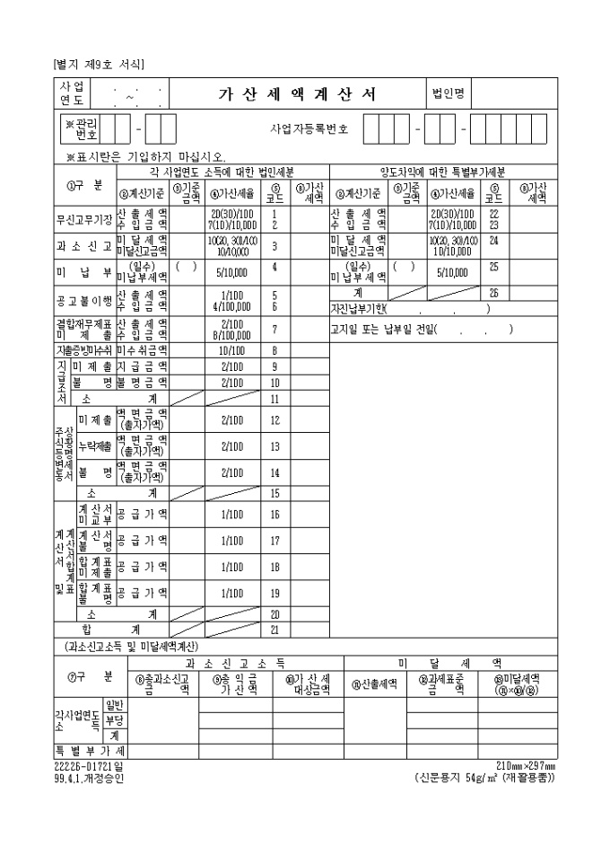 9,000원/월가산세액계산서 별지 제9호 서식 양식입니다. [작 성 요 령] 1. 무신고·무기장가산세 산출세액(법 제56조의 규정에 의한 적정유보초과소득에 대한 법인세를 제외합니다) 또는 수입금액에 가산세율을 적용하여 산출된 금액 중 큰 금액을 가산세액으로 하고 적은 금액은 ( )표시합니다. 2. 과소신고가산세 ⑧란의 총과소신고 금액에서 일반과소신고금액과 부당과소신고금액으로 구분하여 ⑩란의 가산세적용 대상금액을 계산한 후 동금