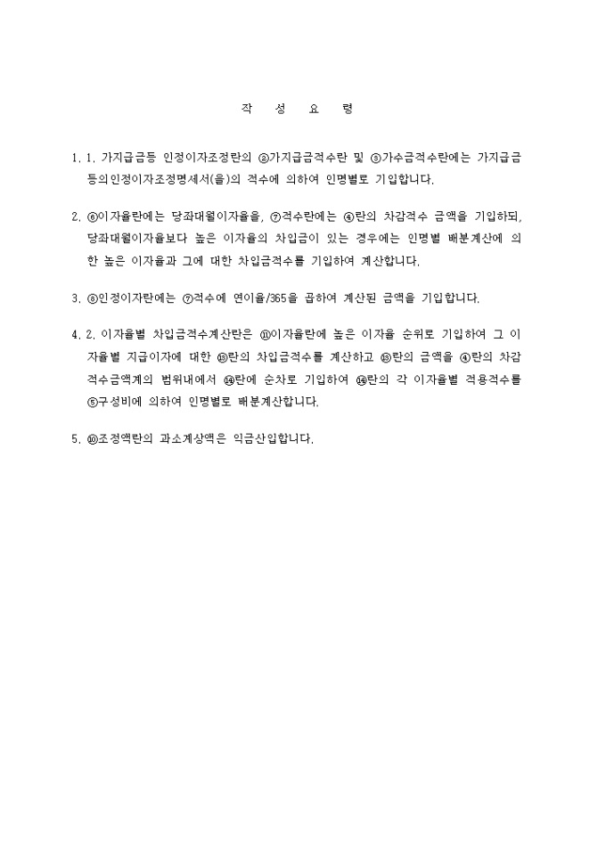 2. ⑥이자율란에는 당좌대월이자율을, ⑦적수란에는 ④란의 차감적수 금액을 기입하되, 당좌대월이자율보다 높은 이자율의 차입금이 있는 경우에는 인명별 배분계산에 의한 높은 이자율과 그에 대한 차입금적수를 기입하여 계산합니다.