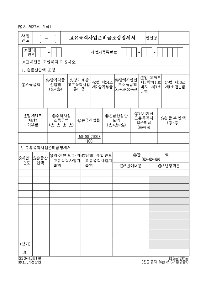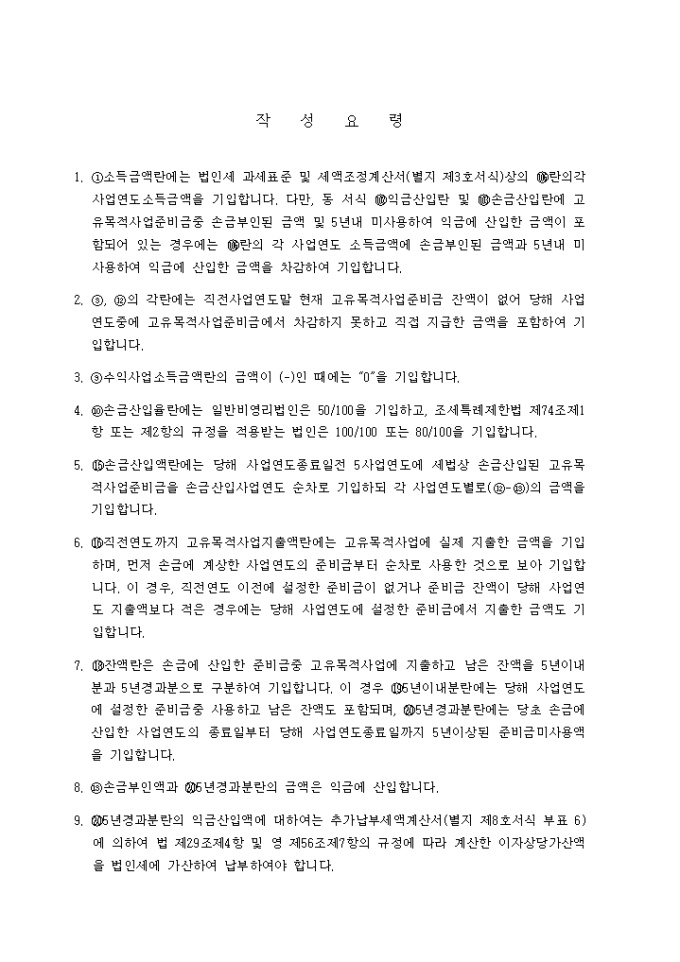 9,000원/월[별지 제27호 서식] 고유목적사업준비금조정명세서 양식입니다. 1. 손금산입액 조정 2. 고유목적사업준비금명세서의 세부 항목으로 구성된 양식입니다. [작 성 요 령] 1. 소득금액란에는 법인세 과세표준 및 세액조정계산서(별지 제3호서식)상의 란의각 사업연도소득금액을 기입합니다. 다만, 동 서식 익금산입란 및 손금산입란에 고유목적사업준비금중 손금부인된 금액 및 5년내 미사용하여 익금에 산입한 금액이 포함되어 있는 경우에