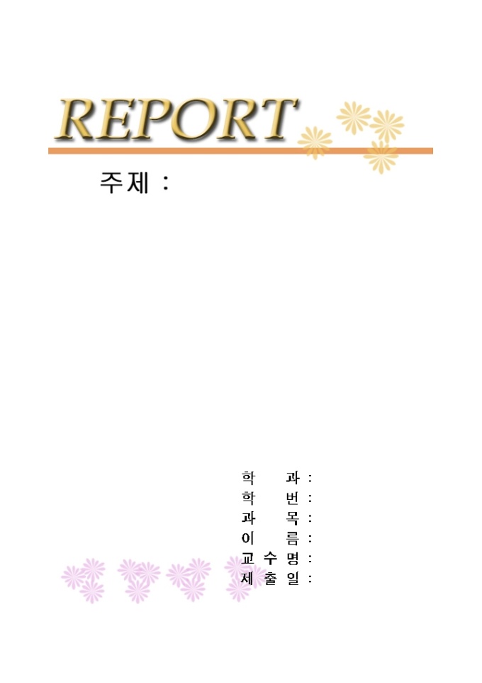 9,000원/월레포트표지(화사한주황색꽃무늬) 레포트 제출시 앞의 표지로 사용하는 서식으로 화사한주황색꽃무늬로 디자인되어 있습니다.