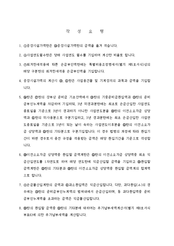 3. ⑦최저한세적용에 따른 손금부인액란에는 특별비용조정명세서(별지 제5호서식)상의 해당 구분란의 최저한세적용 손금부인액을 기입합니다.