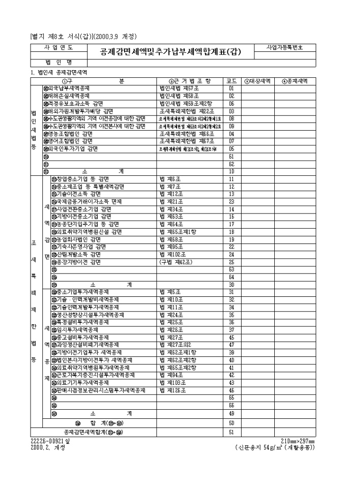 법인세법·조세특례제한법 등에 의한 공제감면대상금액이 있는 경우 공제감면세액계산서등[별지 제8호 서식 부표 1, 2, 3, 4, 5]에 의하여 ①란에 감면구분별로 기입합니다. 란은 공제감면세액계산서(2)(별지 제8호 서식 부표 2)상의 ⑥란의 합계금액을 기입합니다.
