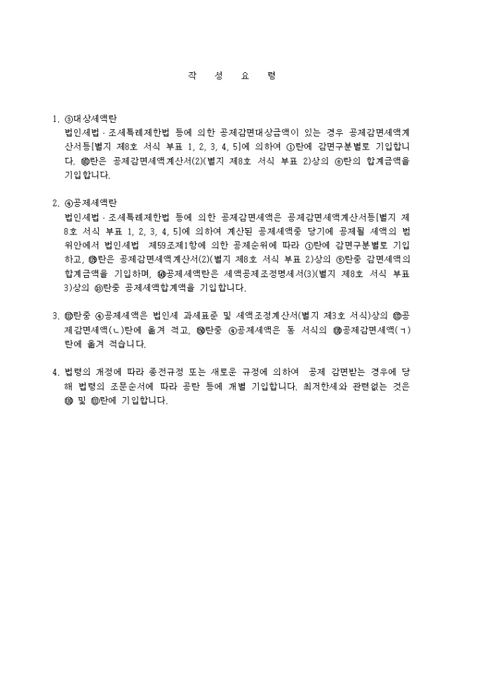 법인세법·조세특례제한법 등에 의한 공제감면세액은 공제감면세액계산서등[별지 제8호 서식 부표 1, 2, 3, 4, 5]에 의하여 계산된 공제세액중 당기에 공제될 세액의 범위안에서 법인세법 제59조제1항에 의한 공제순위에 따라 ①란에 감면구분별로 기입하고, 란은 공제감면세액계산서(2)(별지 제8호 서식 부표 2)상의 ⑤란중 감면세액의 합계금액을 기입하며, 공제세액란은 세액공제조정명세서(3)(별지 제8호 서식 부표 3)상의 ⑬란중 공제세액합계액을 기입합니다.