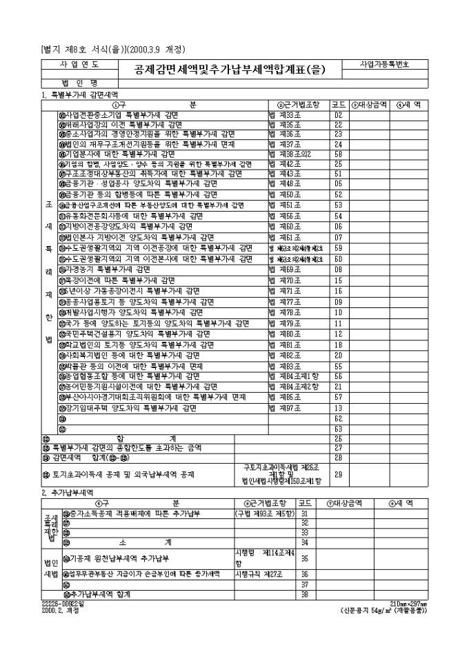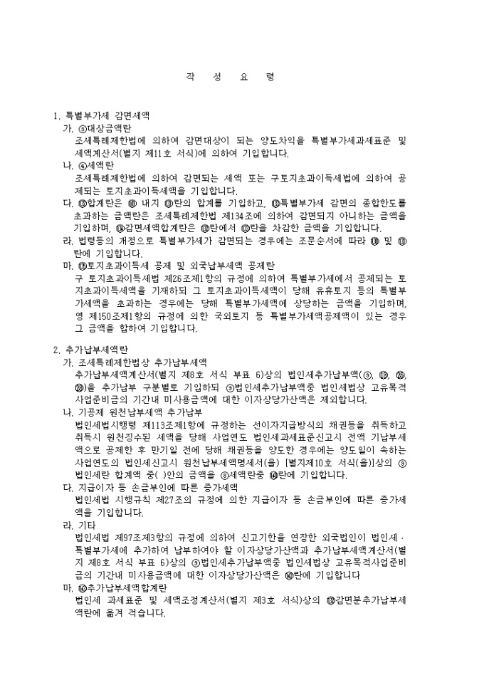 라. 법령등의 개정으로 특별부가세가 감면되는 경우에는 조문순서에 따라 및 란에 기입합니다.