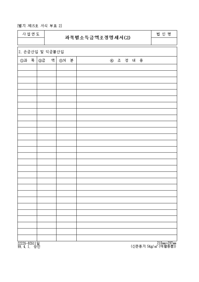 과목별소득금액조정명세서(2)(법인세법 제15호 부표2)