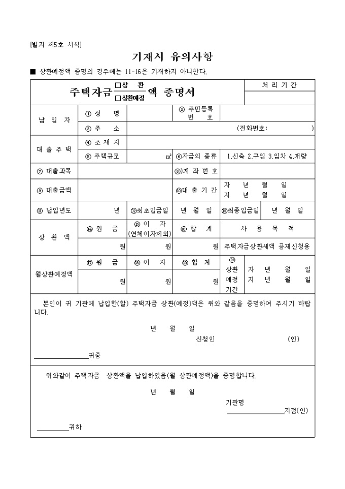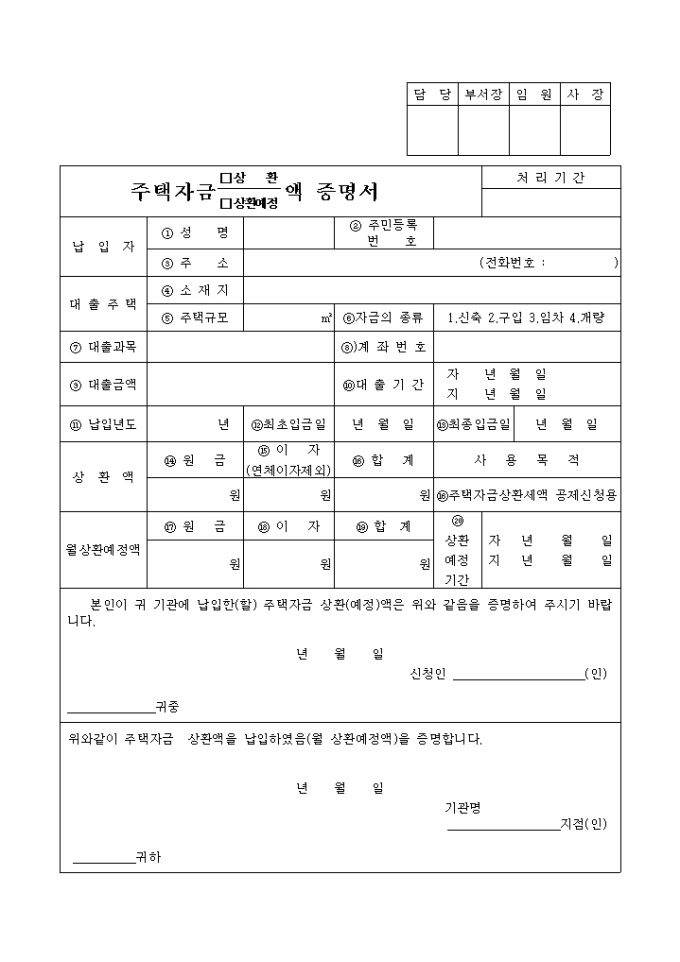 주택자금상환액증명서입니다. 주택 마련을 위해 대출하였던 자금을 일정 금액을 상환하였다는 증명을 확인하는 서식입니다.