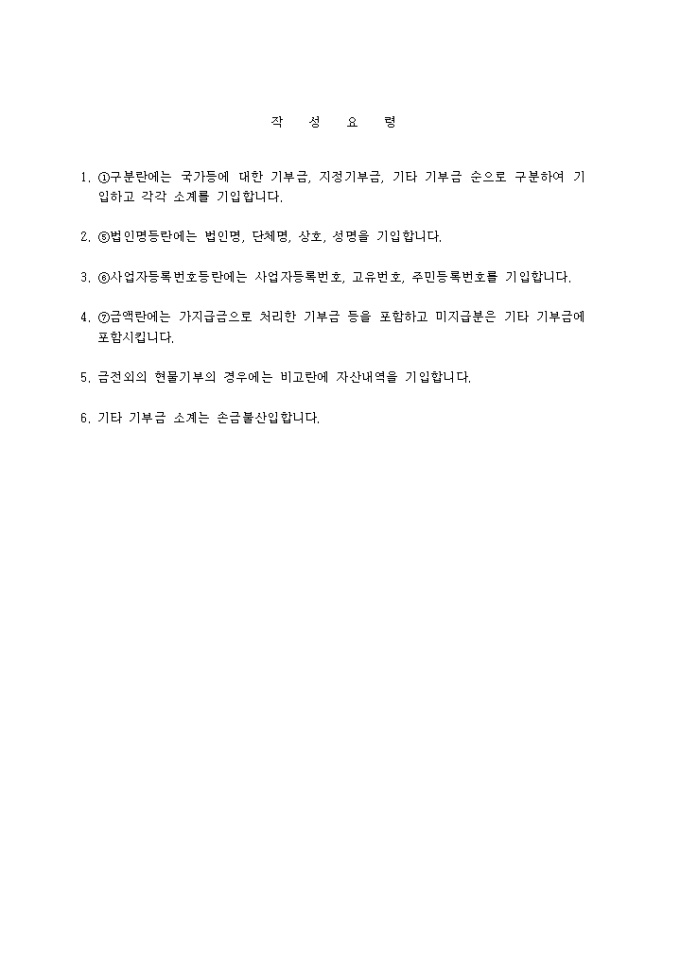 1. 구분란에는 국가등에 대한 기부금, 지정기부금, 기타 기부금 순으로 구분하여 기입하고 각각 소계를 기입합니다.