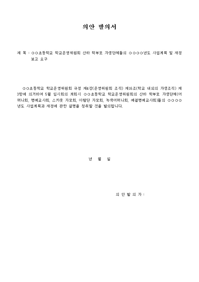 의안 발의 내용을 기록하는 양식으로 제목, 발의내용을 기록합니다.