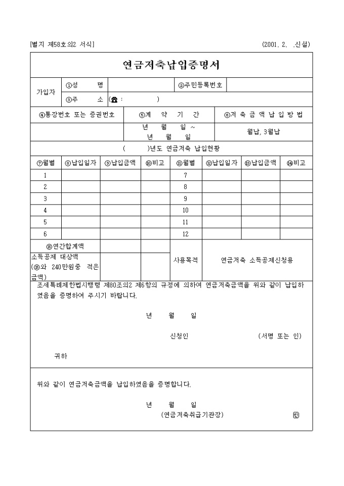 조세특례제한법시행령 제80조의2 제6항의 규정에 의하여 연금저축금액을 납입하였음을 증명하여 주시기 바란다는 내용의 연금저축납입증명서 양식입니다.