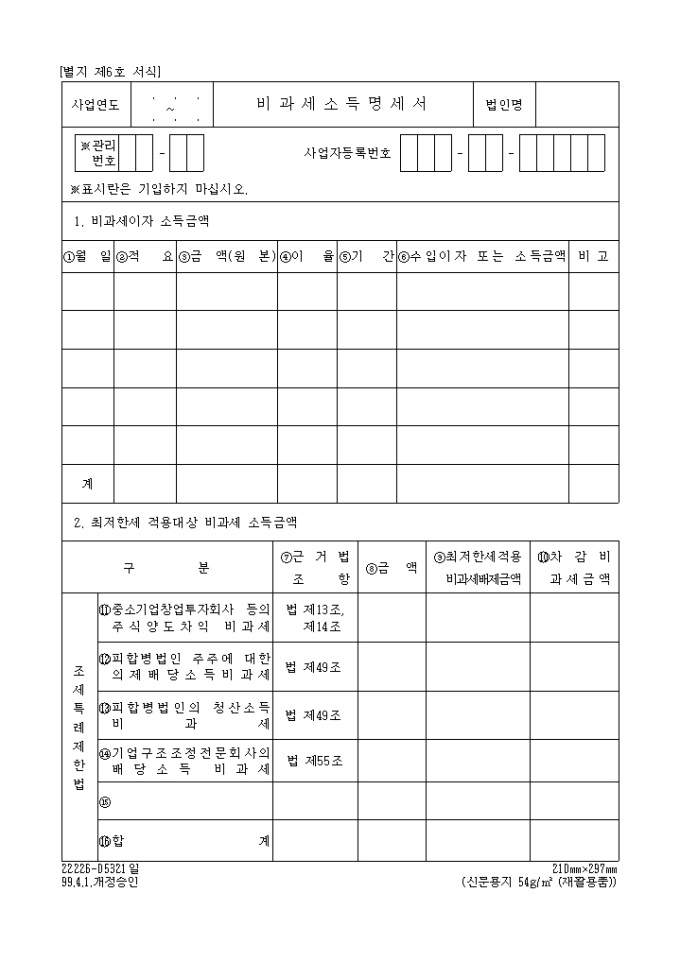 법인세법 제6호 비과세소득명세서