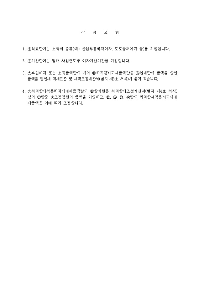 3. 수입이자 또는 소득금액란의 계와 차가감비과세금액란중 합계란의 금액을 합한 금액을 법인세 과세표준 및 세액조정계산서(별지 제3호 서식)에 옮겨 적습니다.