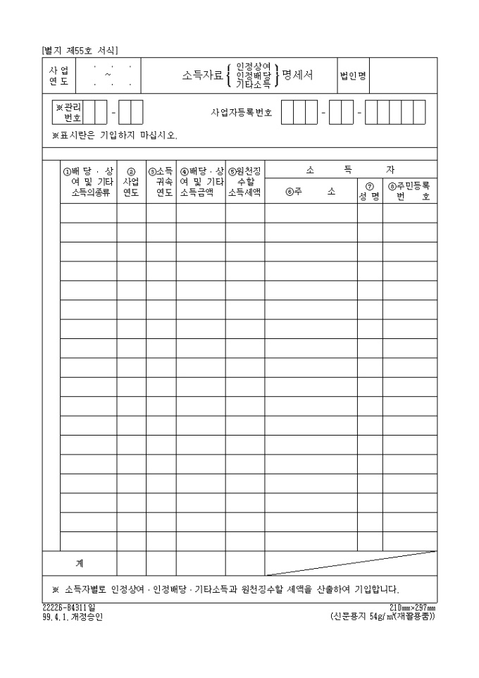 법인세법 제55호 소득자료(인정상여·인정배당·기타소득)명세서
