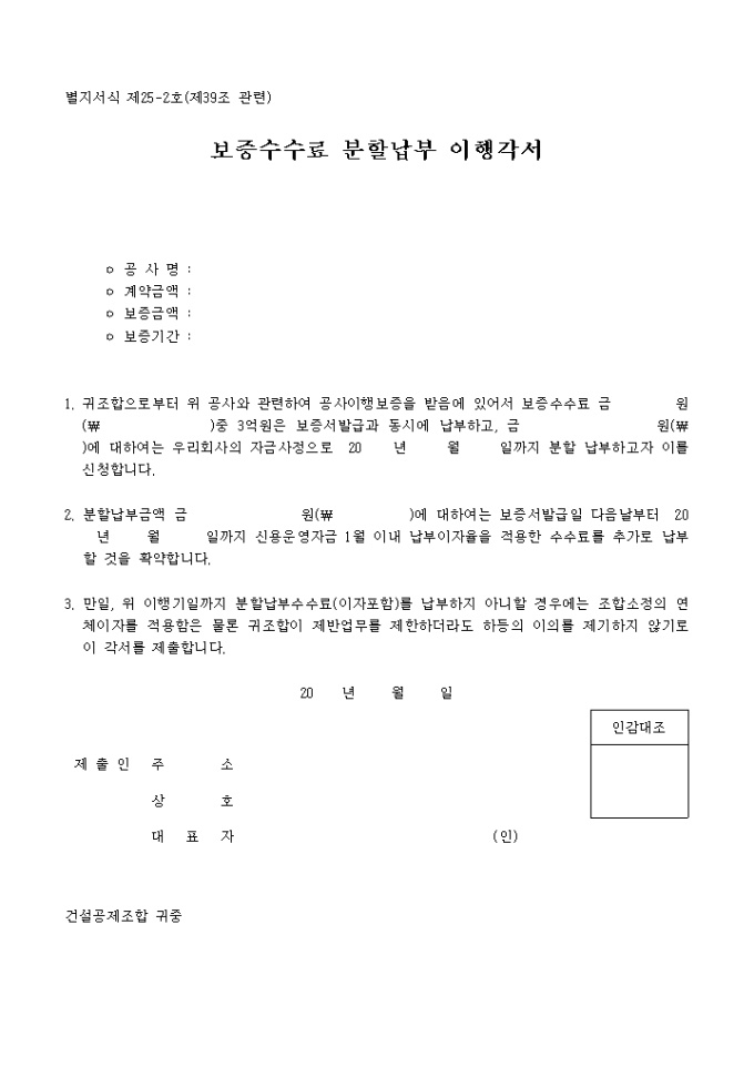 공사명, 계약금액, 보증금액, 보증기간 등을 기재하는 보증수수료분할납부이행각서 양식입니다.