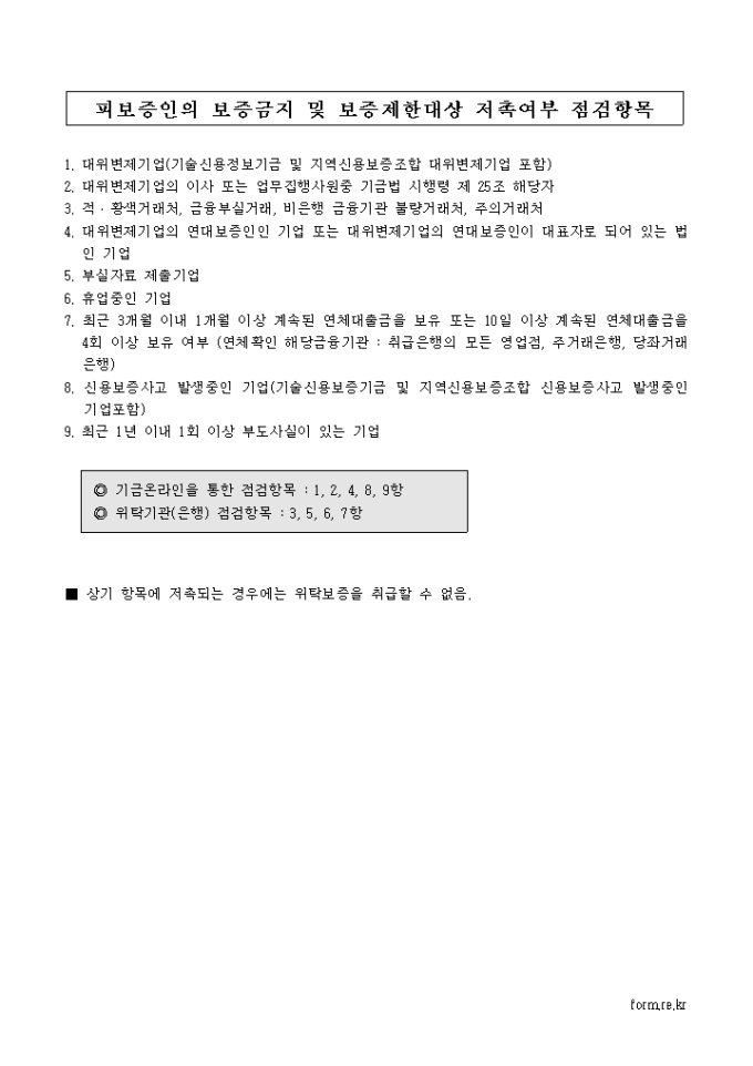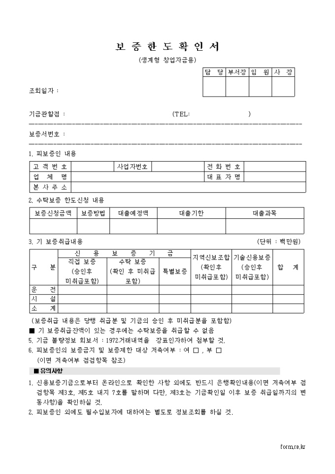 9,000원/월피보증인 내용, 수탁보증 한도신청 내용, 기 보증취급내용, 기금 불량정보 회보서, 피보증인의 보증금지 및 보증제한 대상 저촉여부 등으로 구성된 보증한도확인서(생계형창업자금용) 양식입니다.