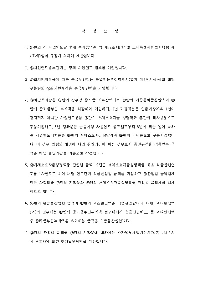 9,000원/월[별지 제31호 서식(4)] 에너지절약시설투자준비금조정명세서 양식입니다. [작 성 요 령] 1. 란의 각 사업연도말 현재 투자금액은 영 제72조제1항 및 조세특례제한법시행령 제4조제3항의 규정에 의하여 계산합니다. 2. 사업연도월수란에는 당해 사업연도 월수를 기입합니다. 3. 최저한세적용에 따른 손금부인액은 특별비용조정명세서(별지 제5호서식)상의 해당 구분란의 최저한세적용 손금부인액을 기입합니다. ....