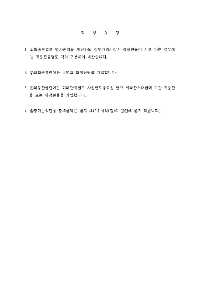 [별지 제40호 서식(을)] 외화자산등평가차손익조정명세서(을) 양식입니다. [작 성 요 령] 1. 외화종류별로 평가손익을 계산하되 장부가액기장시 적용환율이 서로 다른 경우에는 적용환율별로 각각 구분하여 계산합니다. 2. ②외화종류란에는 국명과 화폐단위를 기입합니다. 3. ⑧적용환율란에는 화폐단위별로 사업연도종료일 현재 외국환거래법에 의한 기준환율 또는 재정환율을 기입합니다. ....
