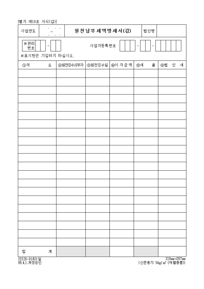 9,000원/월[별지 제10호 서식(갑)] 원천납부세액명세서(갑) 양식입니다. [작 성 요 령] 1. 이 서식은 보유기간이자상당액에 대하여 원천징수되는 채권 등의 이자소득을 제외한 이자소득 및 증권투자신탁수익의 분배금에 대하여 작성합니다. 2. 적요란에는 사채이자, 정기예금이자 등 이자소득이 발생하는 사유를 기입합니다. 3. 일반법인의 경우 법인세란의 합계금액과 원천납부세액명세서 [별지 제10호 서식(을)] 란의 합계금액을 합하여
