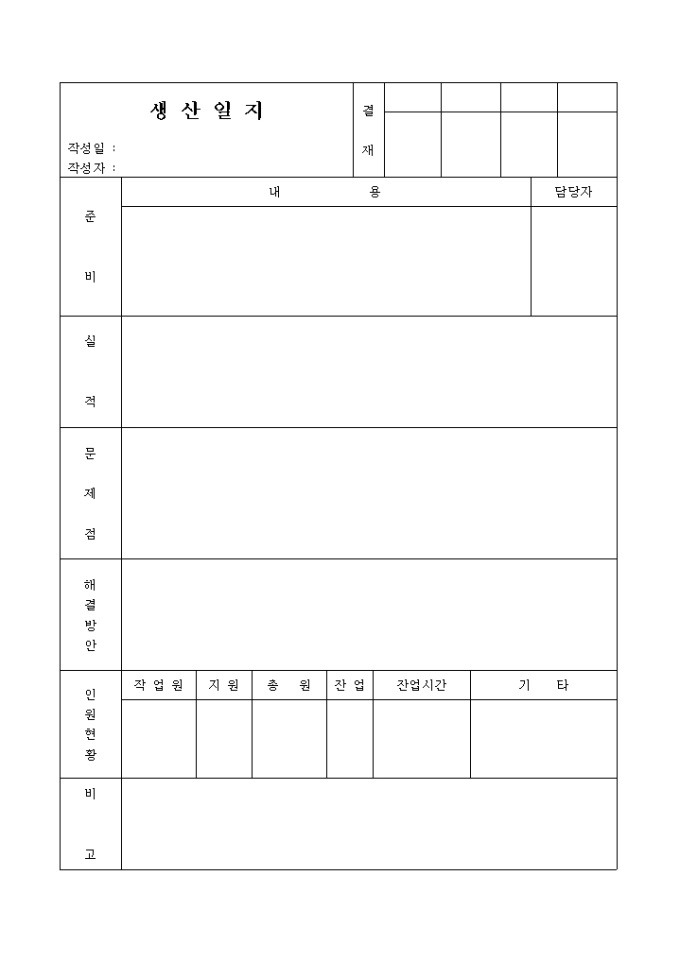 준비내용, 실적, 문제점, 해결방안, 인원현황 등을 기재하는 서술직 생산일지 양식입니다.