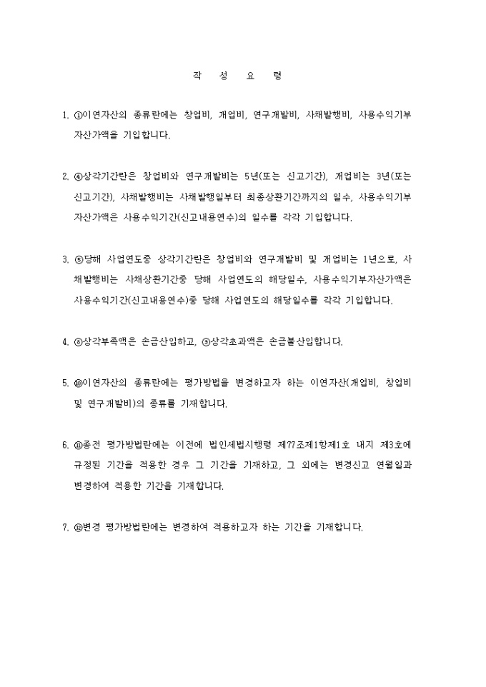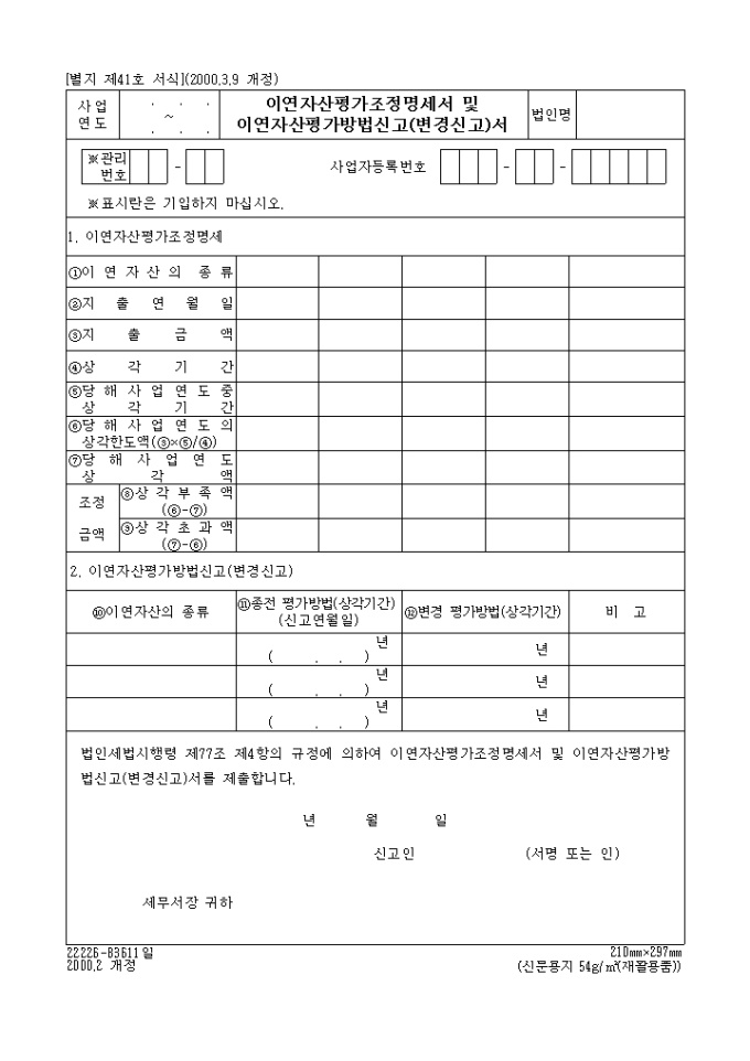 [별지 제41호 서식] 이연자산평가조정명세서 양식입니다. 법인세법시행령 제77조 제4항의 규정에 의하여 이연자산평가조정명세서 및 이연자산평가방법신고(변경신고)서를 제출하실때 사용하는 양식입니다. [작 성 요 령] 1. 이연자산의 종류란에는 창업비, 개업비, 연구개발비, 사채발행비, 사용수익기부자산가액을 기입합니다. 2. 상각기간란은 창업비와 연구개발비는 5년(또는 신고기간), 개업비는 3년(또는 신고기간), 사채발행