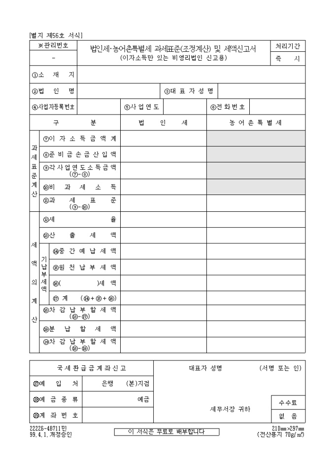 이자소득만있는비영리법인의법인세,농어촌특별세과세표준(조정계산)및세액신고서 양식입니다.
