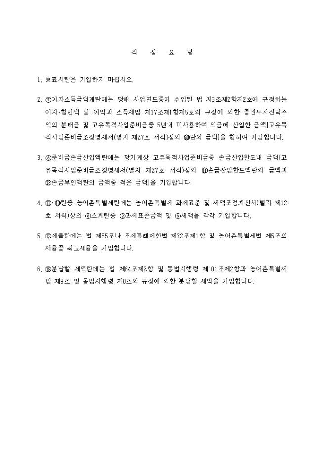 3. 준비금손금산입액란에는 당기계상 고유목적사업준비금중 손금산입한도내 금액[고유목적사업준비금조정명세서(별지 제27호 서식)상의 손금산입한도액란의 금액과 손금부인액란의 금액중 적은 금액]을 기입합니다.
